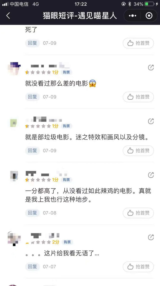 《遇见喵星人》自开拍到上映,宣传不多,关注的人很少。微博话题,演员们宣传,都几乎没有的。说白了就是没有观众知道世上还要这样一部电影存在的,很多观众也是在电影购票APP上看到,随意买了一张。一进电影院后悔声连连,脸上显示着大写的"不值"。