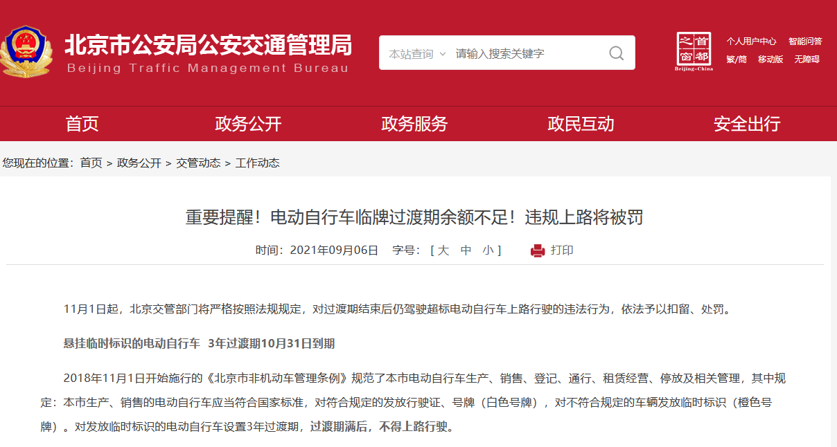 北京:电动自行车临牌过渡期余额不足!违规上路将被罚亚星注册